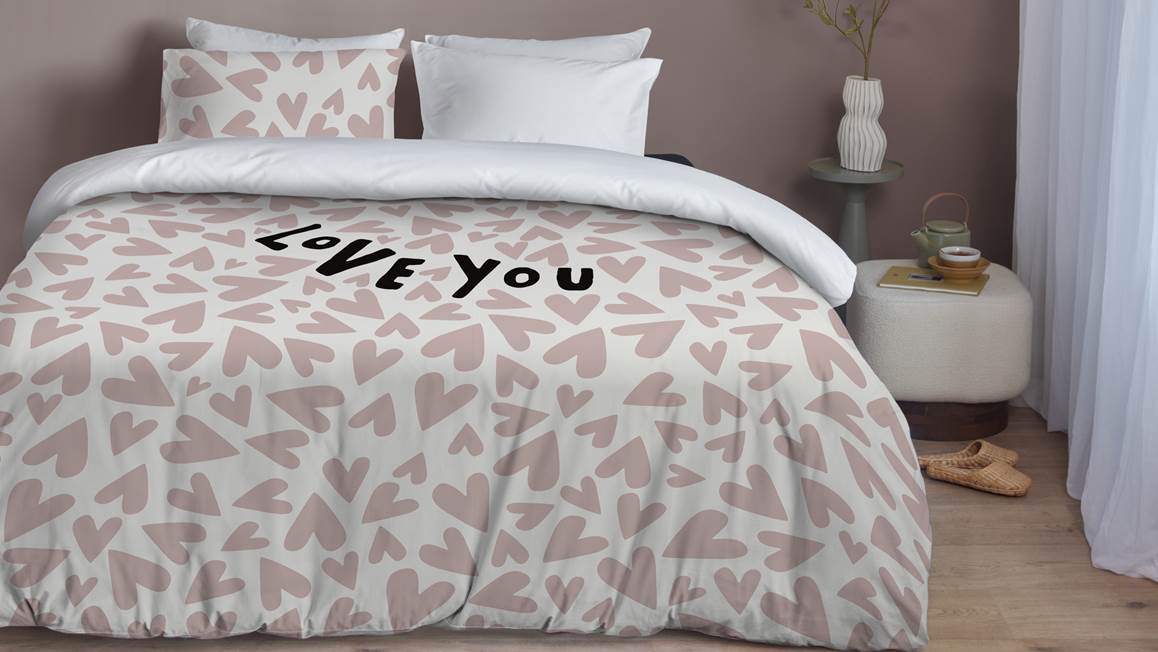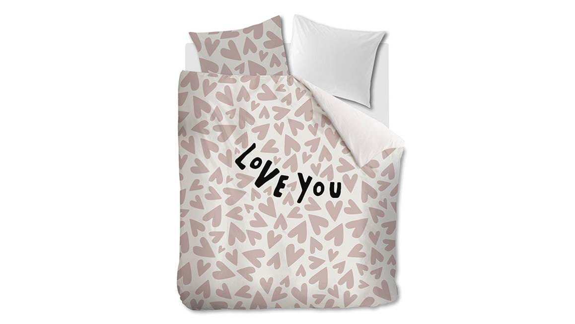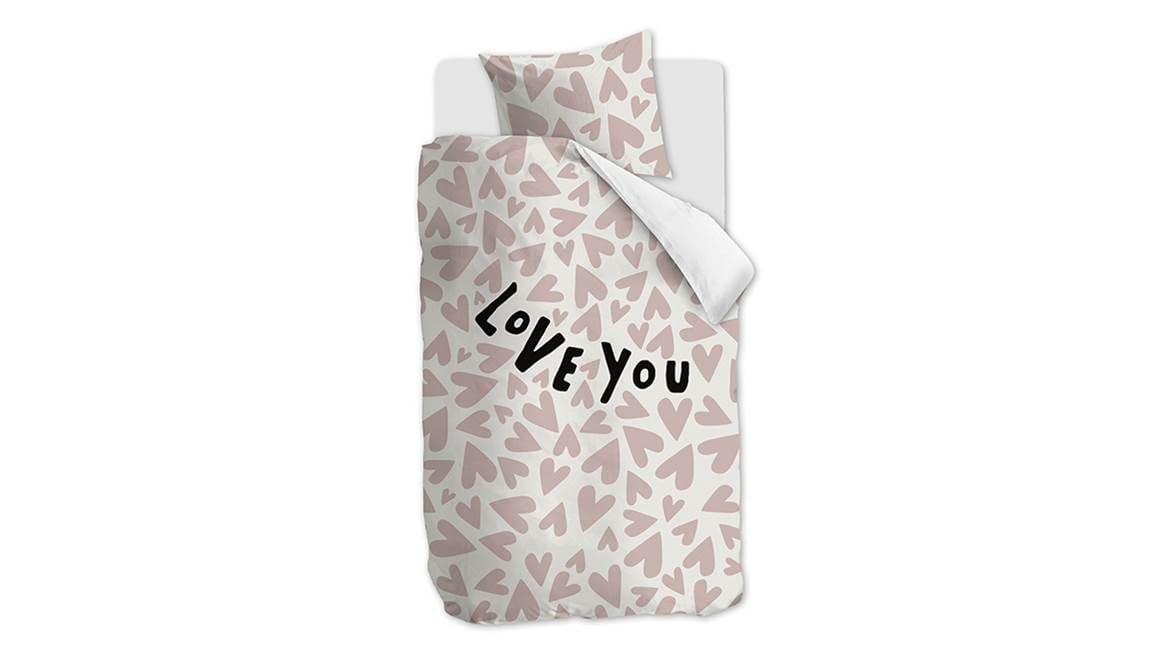 Droom iedere avond heerlijk weg onder het Blushwood Anjo dekbedovertrek. Het overtrek bestaat uit allemaal kleine roze hartjes die speels op het overtrek zijn geplaatst. Tussen de hartjes staat groot de tekst “Love you”. Met de effen witte achterzijde creëer je gemakkelijk een luxe omslag.