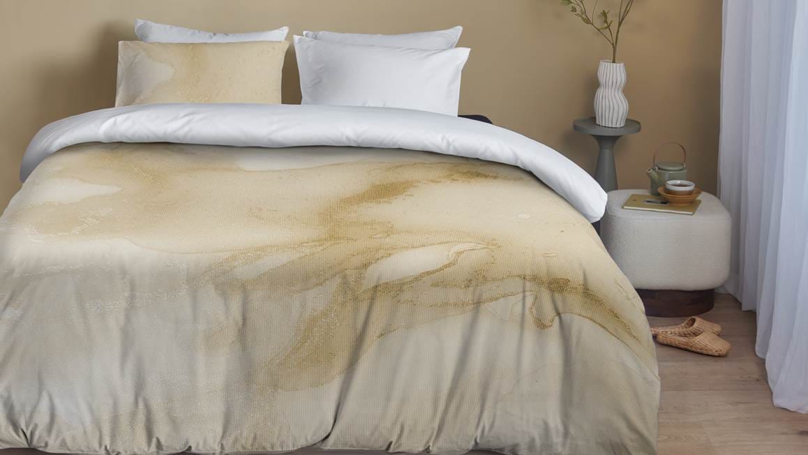Sereniteit en luxe ineen, dat is het Caja dekbedovertrek van Blushwood. Het overtrek bevat een grafische print in zandtinten. De gouden accenten zorgen voor die luxe toevoeging. Met de effen witte achterzijde maak je een mooie omslag.