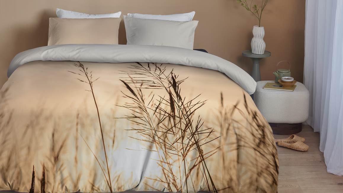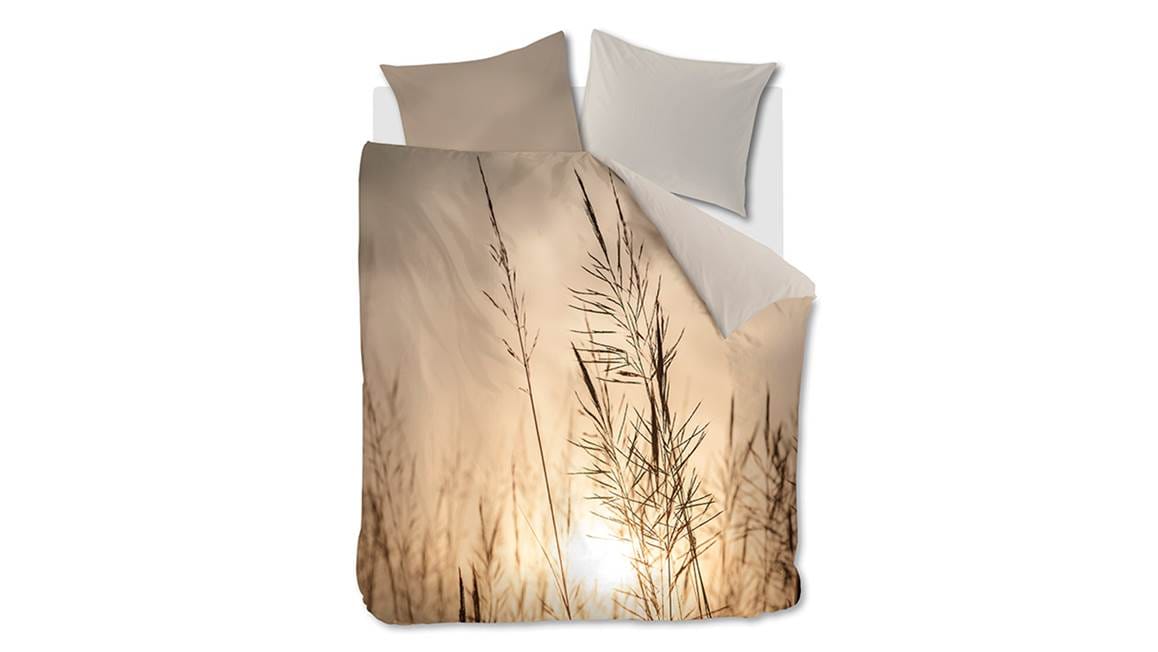 Val iedere avond heerlijk ontspannen in slaap met het Ana dekbedovertrek van het merk Blushwood. Op het overtrek staat en fotoprint van graspluimen tegen een ondergaande zon. Deze print straalt sereniteit uit. Met de effen achterzijde maak je eenvoudig een luxe omslag.
