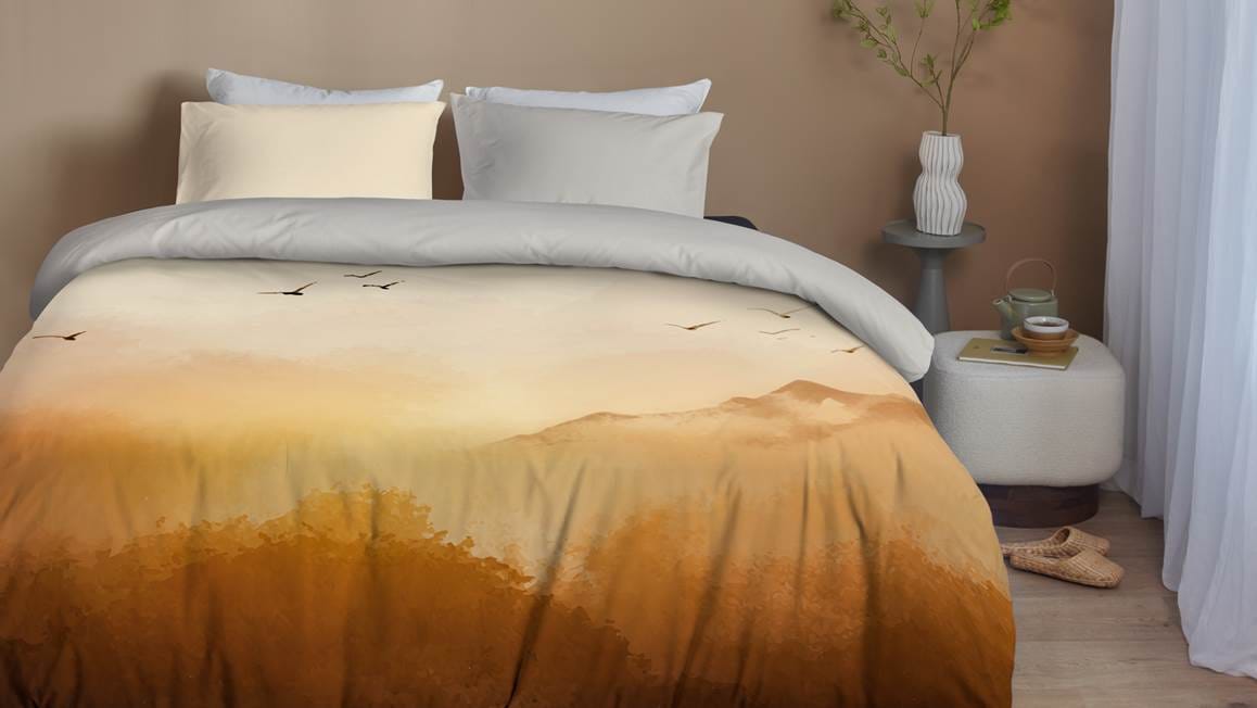Haal het zomerse vakantiegevoel in huis met het Blushwood Tecla dekbedovertrek. De print is een geschilderd berglandschap die dankzij de ondergaande zon uit verschillende tinten oranje ontstaan. In de lucht vliegen enkele vogels. Zo val je iedere avond echt ontspannen in slaap!