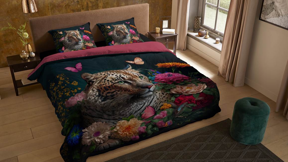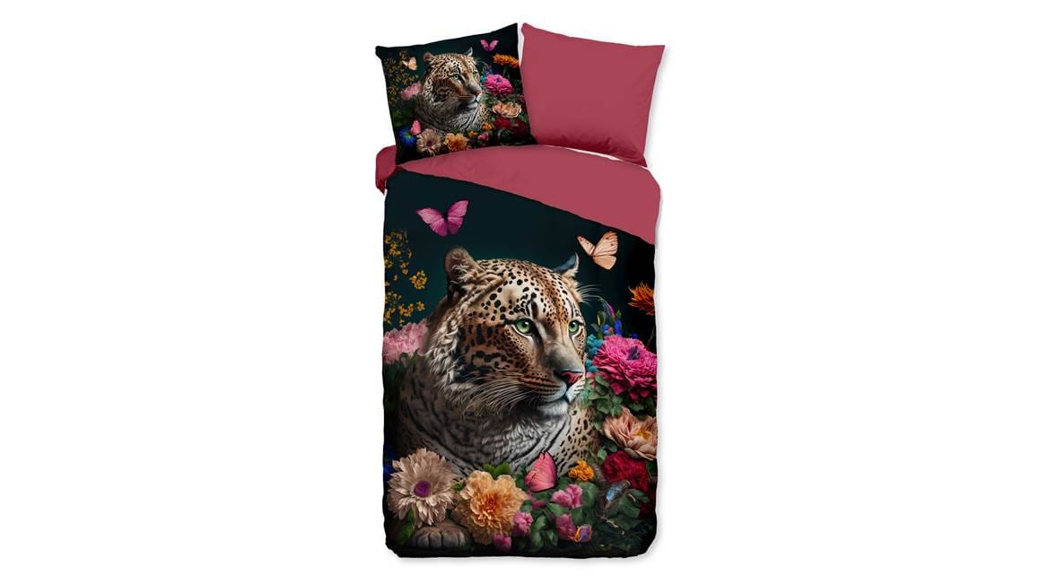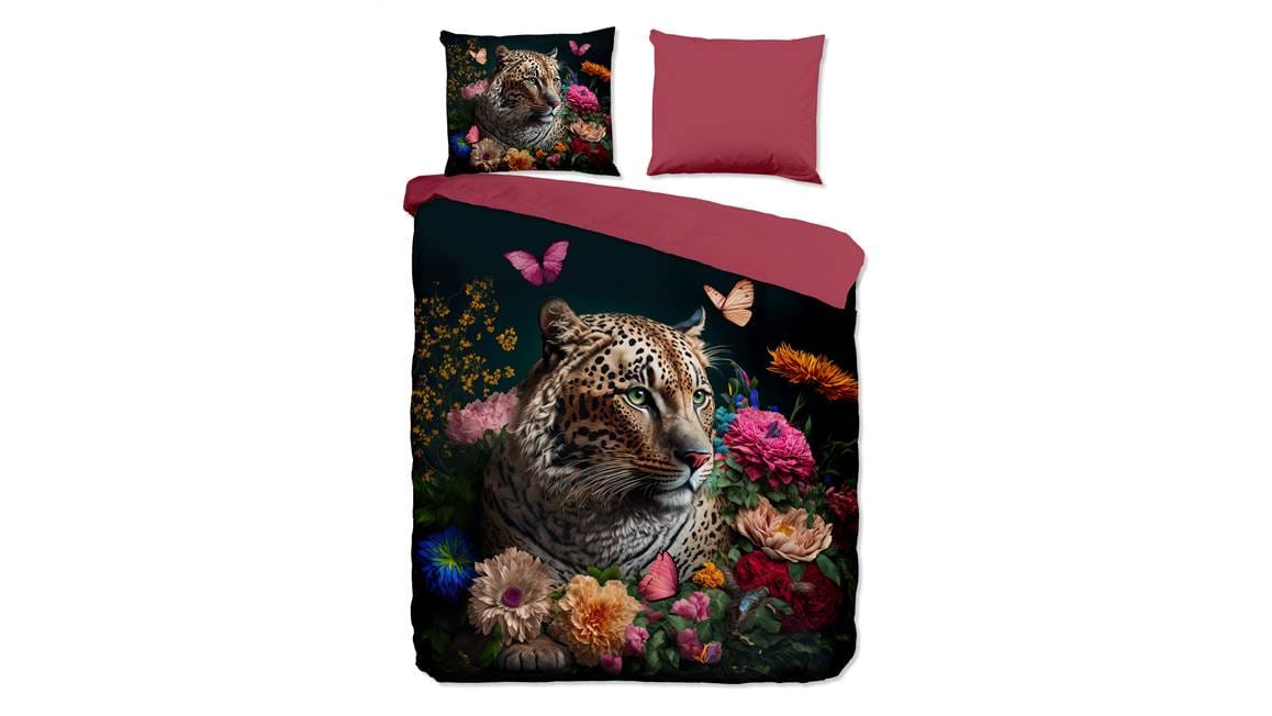 Ben jij op zoek naar een echte eyecatcher voor in de slaapkamer? Dan is het Pure Borra dekbedovertrek echt iets voor jou! Een stoer luipaard wordt omringd door vrolijke en kleurrijke bloemen. De achterzijde van het overtrek is effen roze. Hierdoor kun je leuk mixen en matchen.
