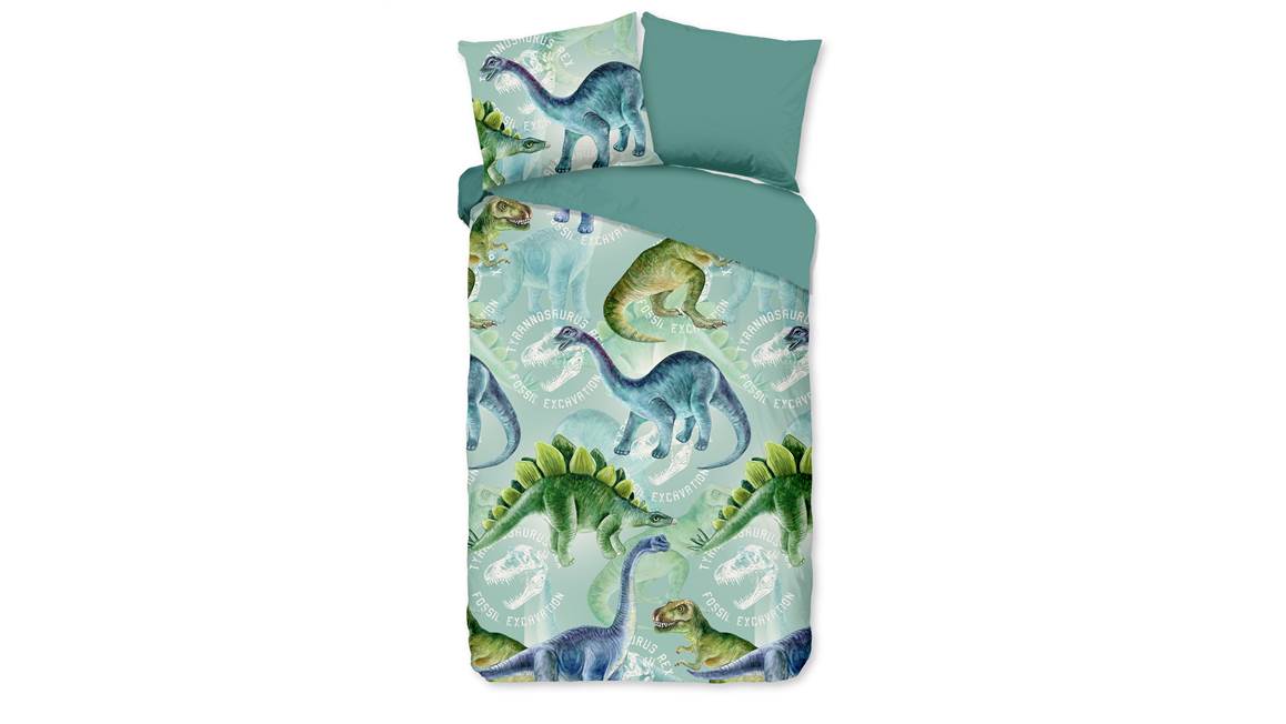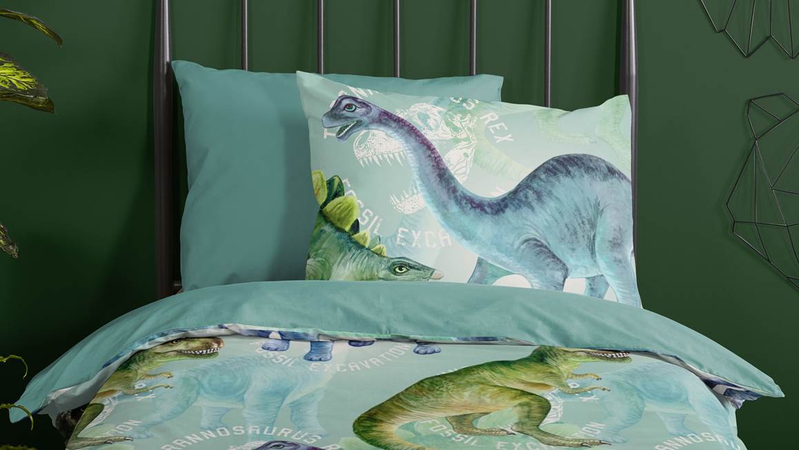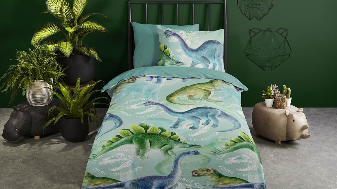 Voor de echte dinosaurusliefhebber is het Vala dekbedovertrek de eyecatcher van de slaapkamer. Het stoere dessin bevat een print met verschillende dinosaurussen. De dinosaurussen komen goed naar voren op de blauwgroene achtergrond.