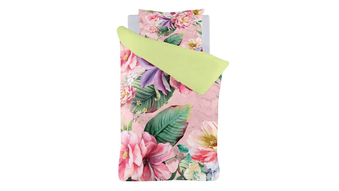 Het Chelsea dekbedovertrek oogt liefdevol door de grote bloemen en bladeren. Het roze dessin heeft een effen groene achterzijde. Hiermee kun je een leuke omslag creëren. De kussenslopen zijn voorzien van dezelfde bloemenprint.