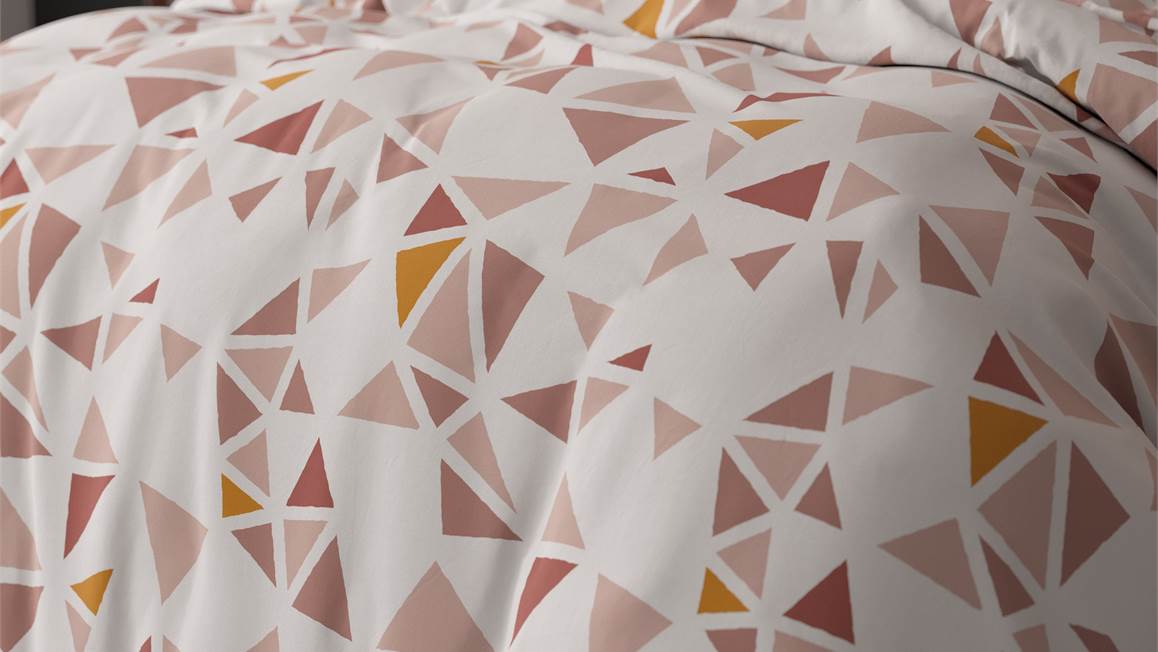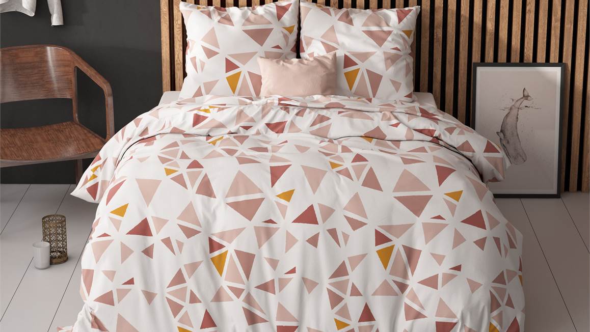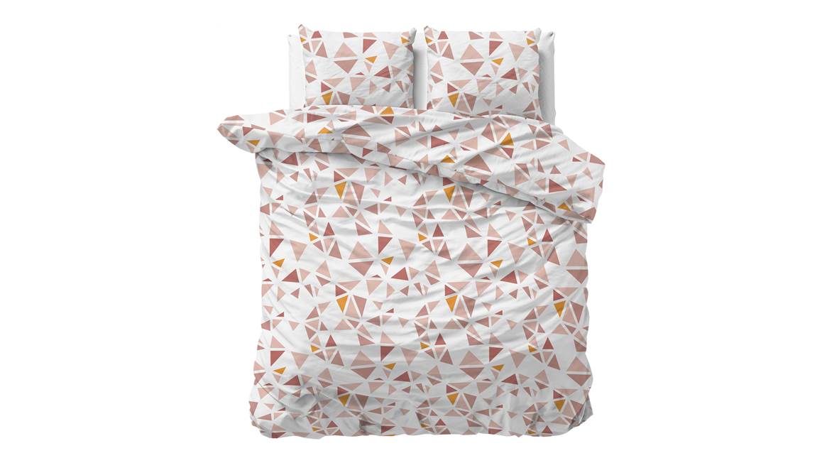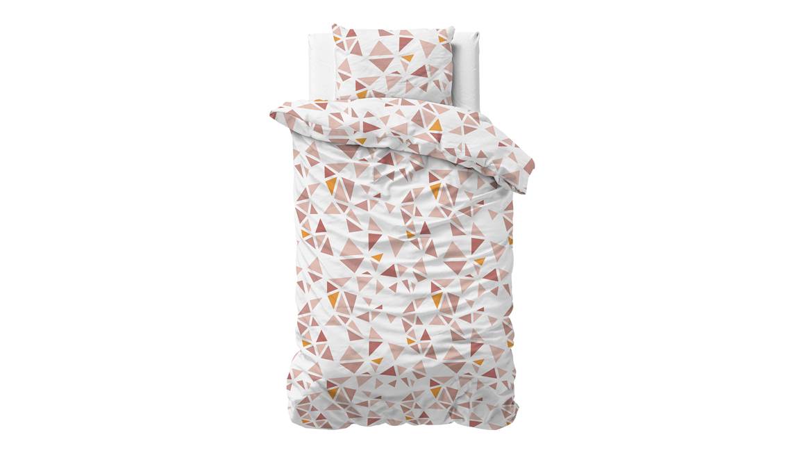Het moderne grafische patroon van het Bella dekbedovertrek zorgt voor een frisse uitstraling in de slaapkamer. De verschillende geometrische vormen in het roze, met hier en daar een oranje accent, komen goed uit op de witte ondergrond.