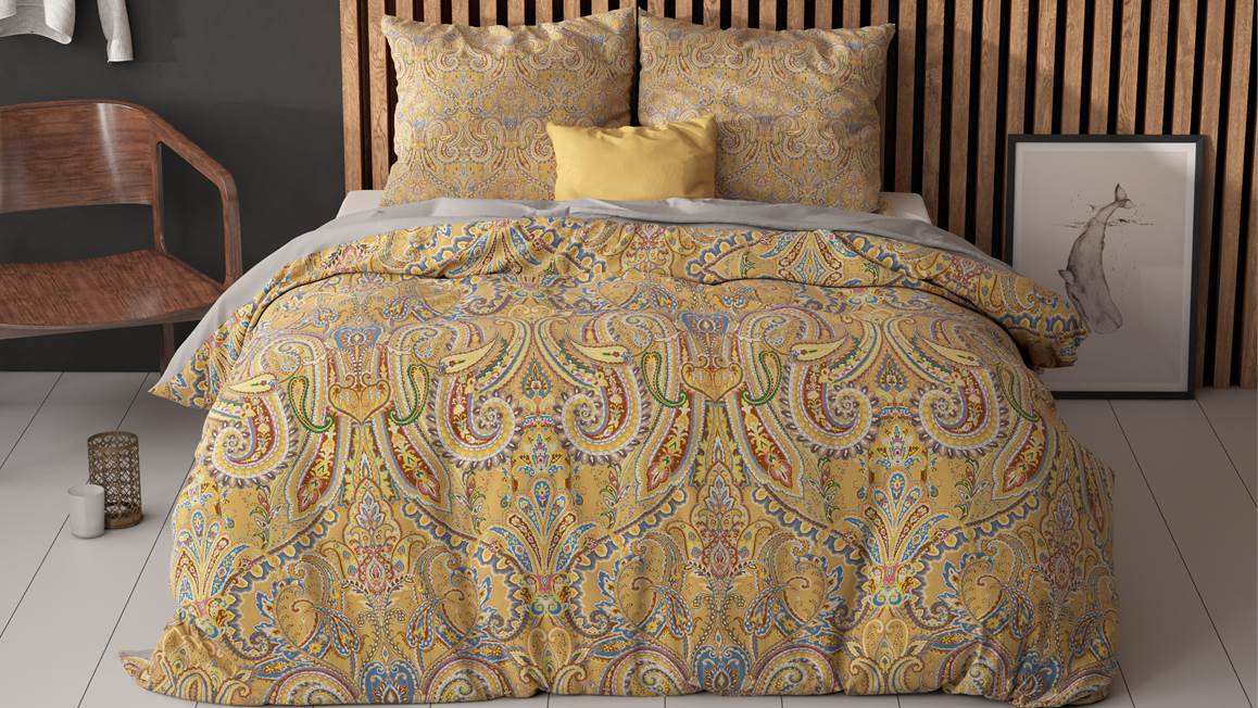 Het Sleeptime Emeline dekbedovertrek is een kleurrijke verschijning! Dankzij het goudkleurige dessin krijgt je slaapkamer een prachtige uitstraling. De sierlijke ornamenten zijn verrijkt met verfijnde details en de achterzijde is grijs.