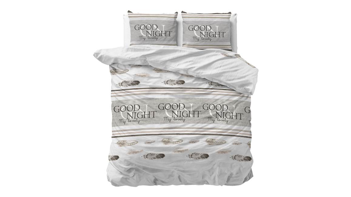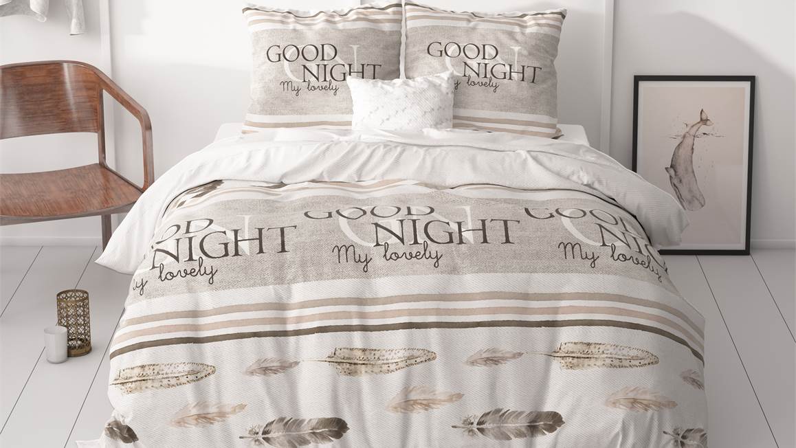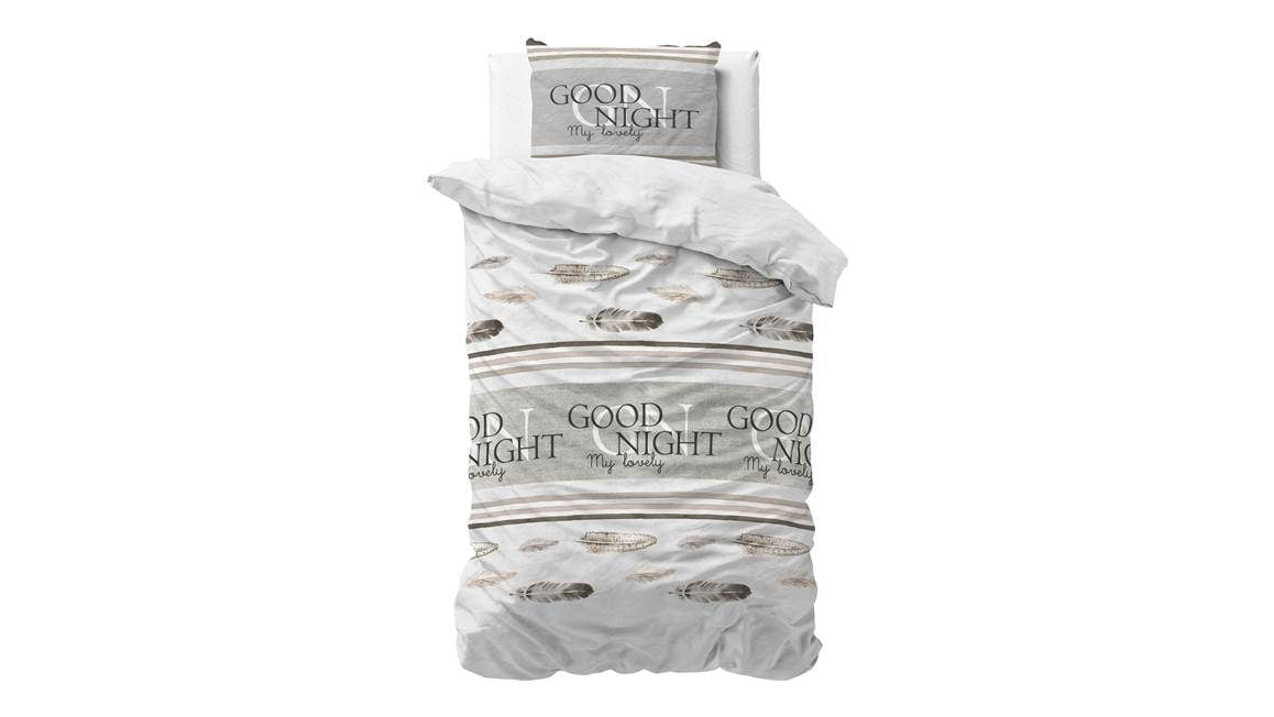 Met het Sleeptime Good Night dekbedovertrek ben je verzekerd van een goede nachtrust! De kalmerende kleuren, samen met het subtiele verenpatroon en de geruststellende boodschap “Good night my lovely”, creëren een rustgevende sfeer.