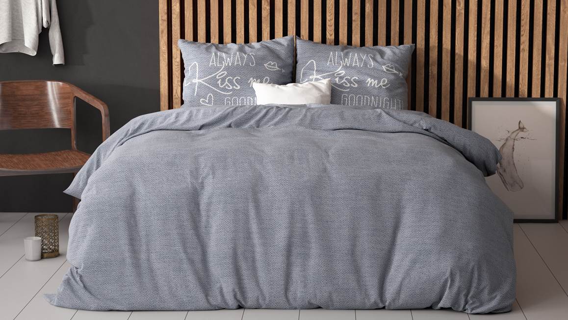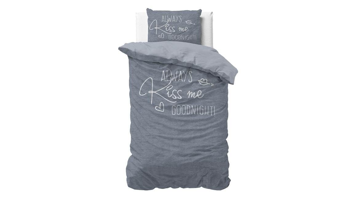 Val iedere avond heerlijk in slaap onder het Sleeptime Kiss Me dekbedovertrek. Het blauwe overtrek bevat groot de tekst “Always Kiss me Goodnight!”. Zo val je altijd gelief in slaap. De achterzijde is effen van kleur voor een speels effect.