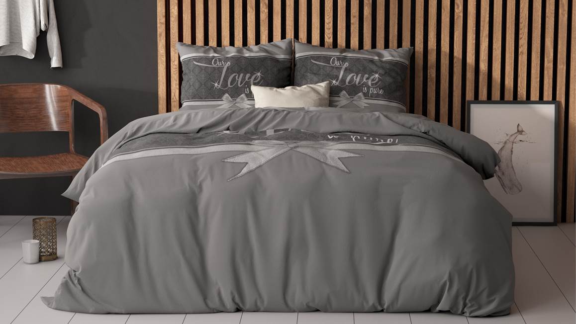 Droom iedere avond heerlijk weg onder het grijze Pure Love dekbedovertrek van het bekende merk Sleeptime. Het grijze overtrek bevat de tekst “Pure Love” met daaronder een grote strik. Ook op de bijbehorende kussenslopen vind je deze tekst. Zo is het plaatje helemaal compleet!