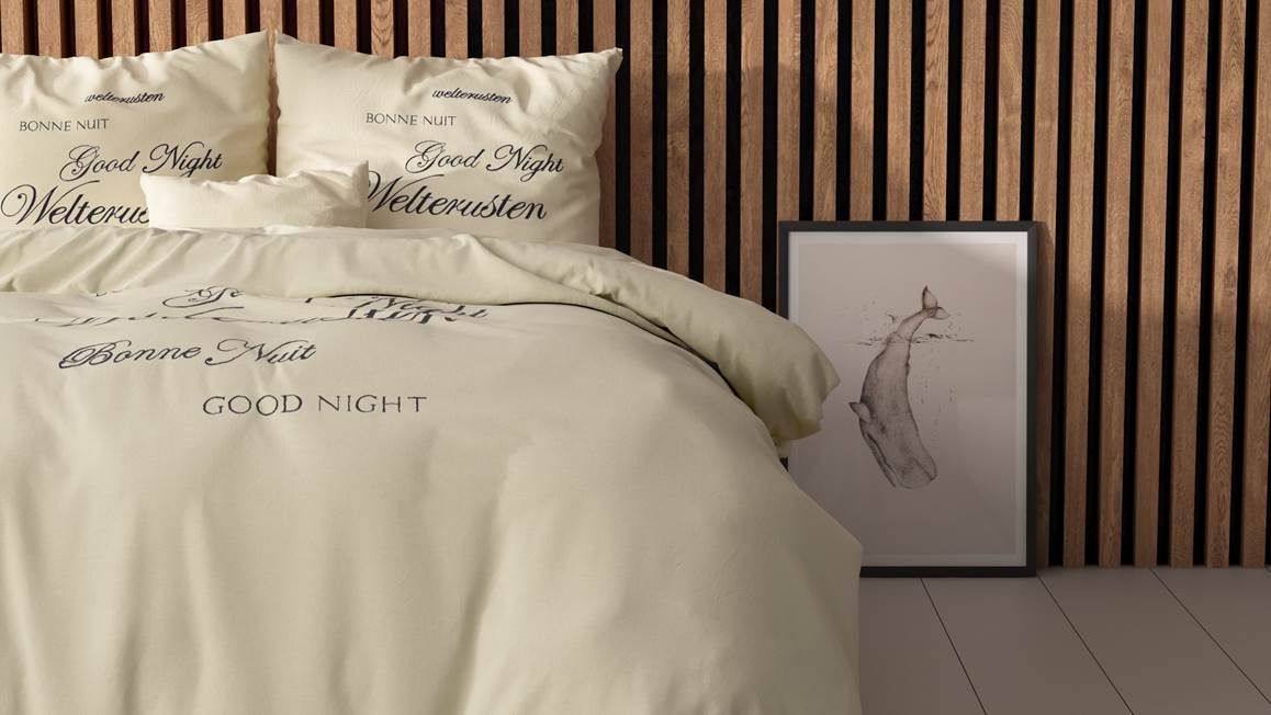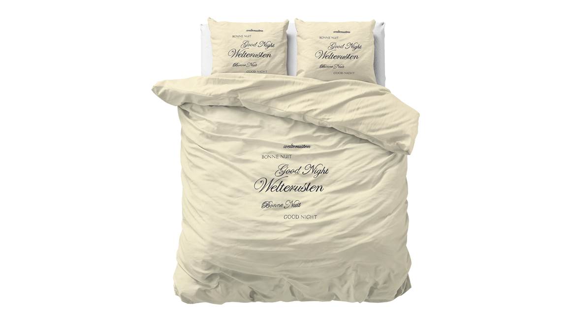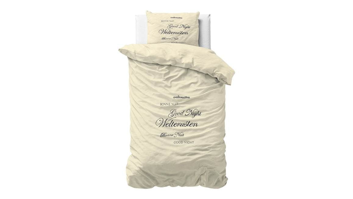 Met het Sleeptime Welterusten dekbedovertrek geniet je altijd van een heerlijke nachtrust! Het woord “welterusten” wordt weergegeven in diverse talen. De zwarte tekst vormt een prachtig contrast op het crèmekleurige effen dekbedovertrek.