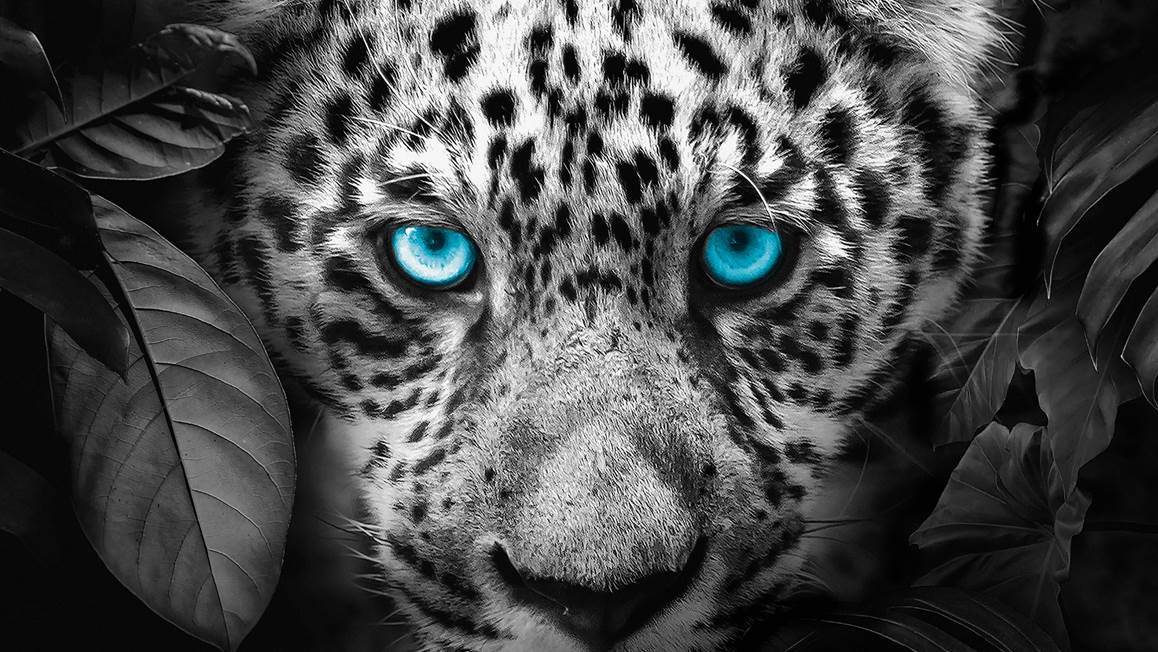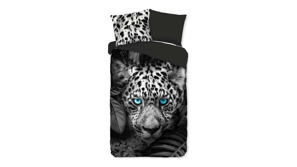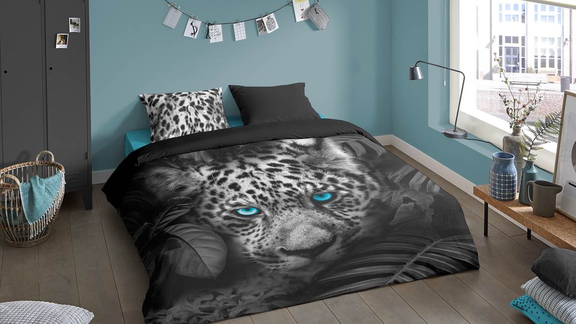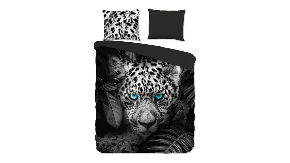 De panter op het Pure Blue Eyes overtrek is een echte eyecatcher. Het wilde dier kijkt je recht aan met zijn felblauwe ogen. Zijn ogen komen prachtig uit dankzij de zwart en wit tinten. De achterzijde is effen antraciet.