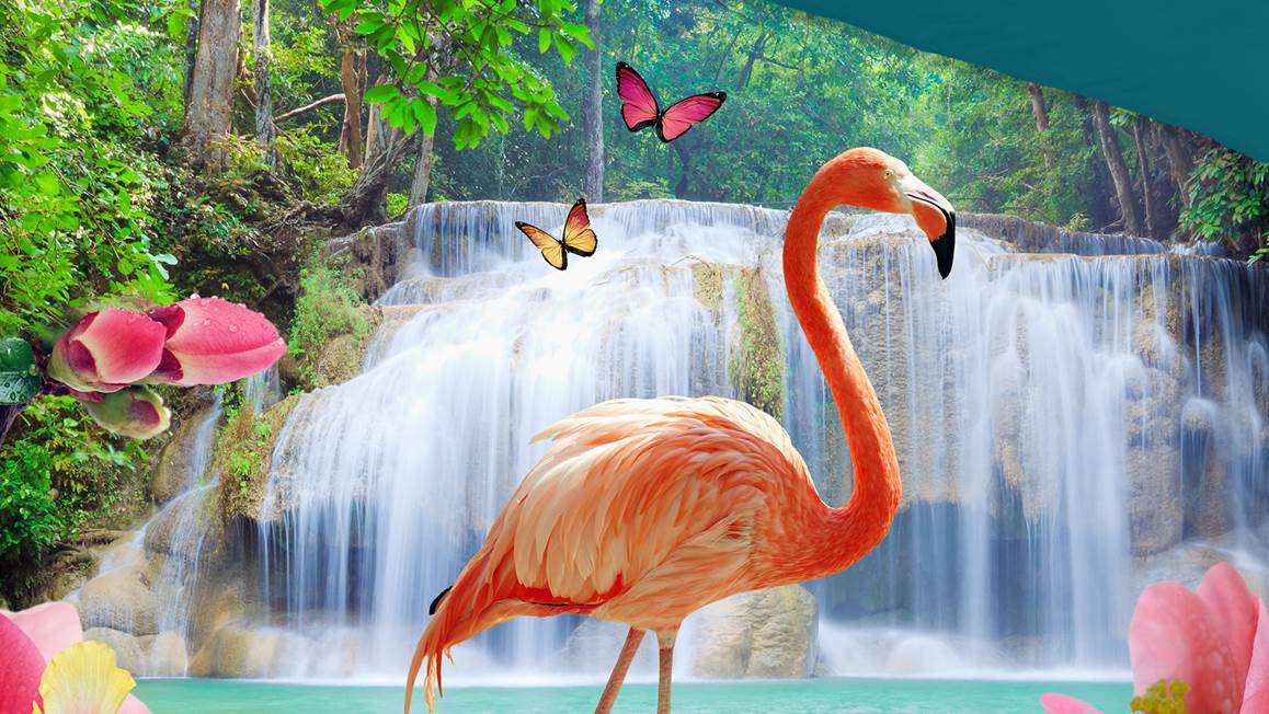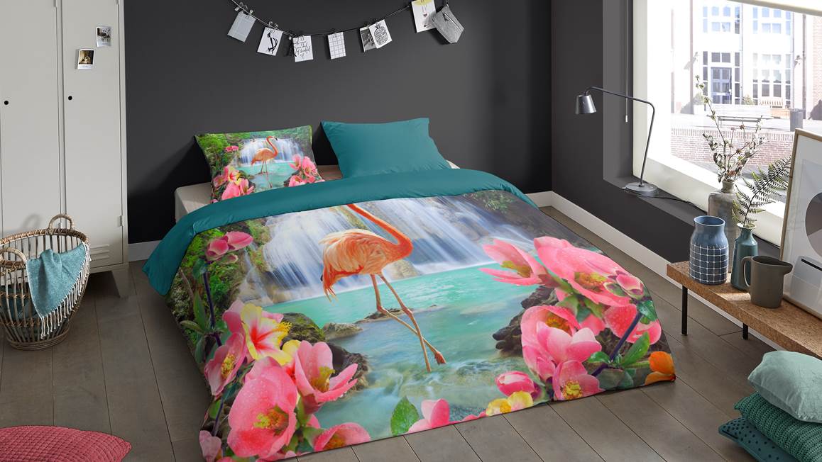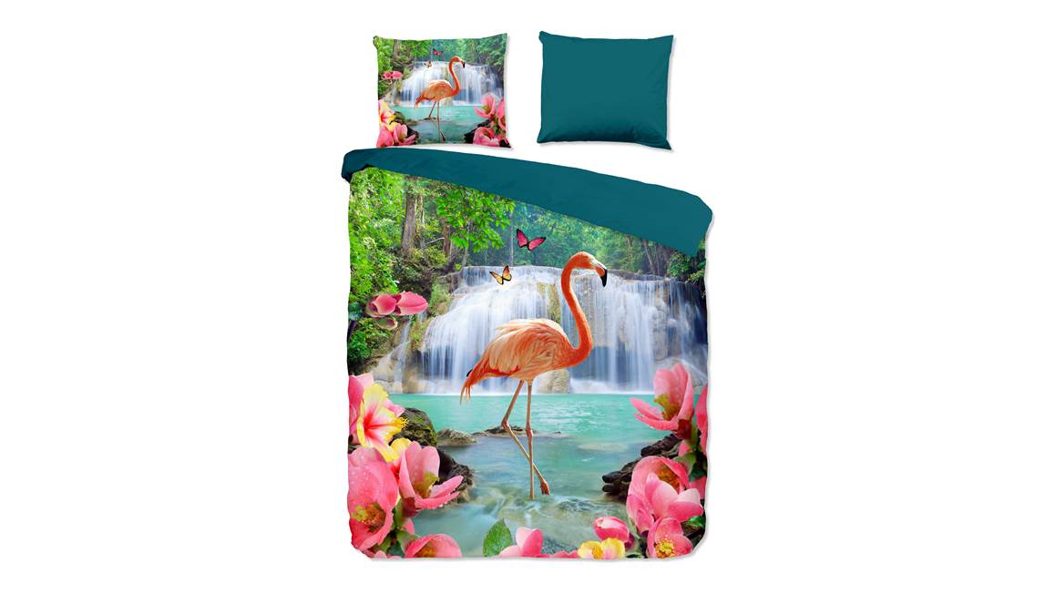 Ben jij een dierenliefhebber? Dan kan het Pure Flamingo dekbedovertrek niet ontbreken in je slaapkamer. De prachtige roze flamingo staat heerlijk in het water. Op de achtergrond zie je een waterval en op de voorgrond meerdere roze bloemen.