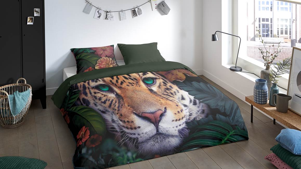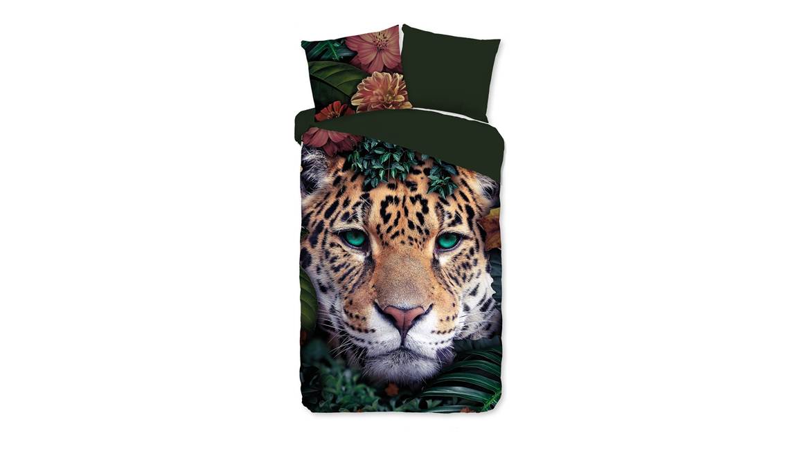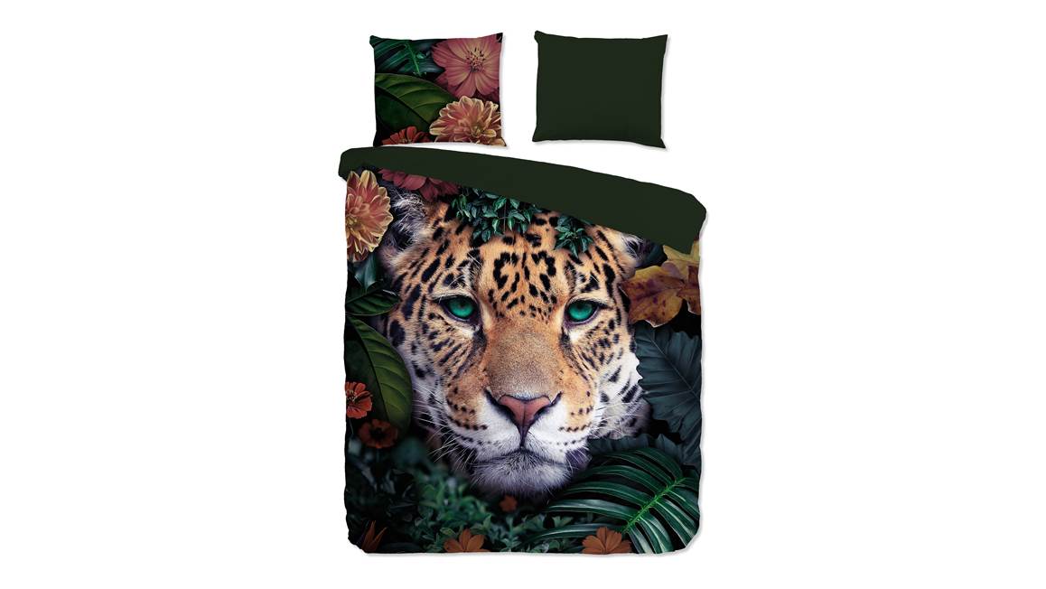 Met het Pure Wildlife Flowers dekbedovertrek valt je oog gelijk op de wilde panter. Het wilde dier wordt omringd door bloemen en bladeren. Dit geeft het overtrek een exotische uitstraling. De achterzijde heeft een effen groene kleur.