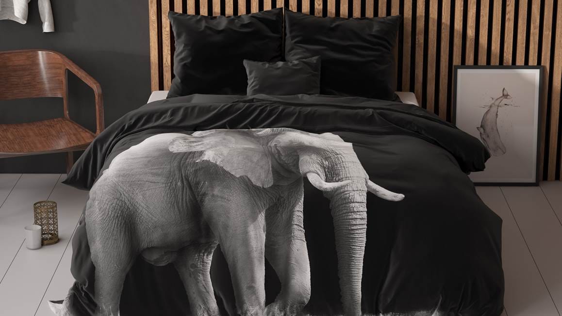 Met het Sleeptime Elephant dekbedovertrek haal je een echte eyecatcher in huis! Op het zwarte overtrek staat een prachtige olifant afgebeeld. De zwart-wit print oogt erg rustgevend en stijlvol. De bijbehorende kussenslopen zijn effen van kleur.
