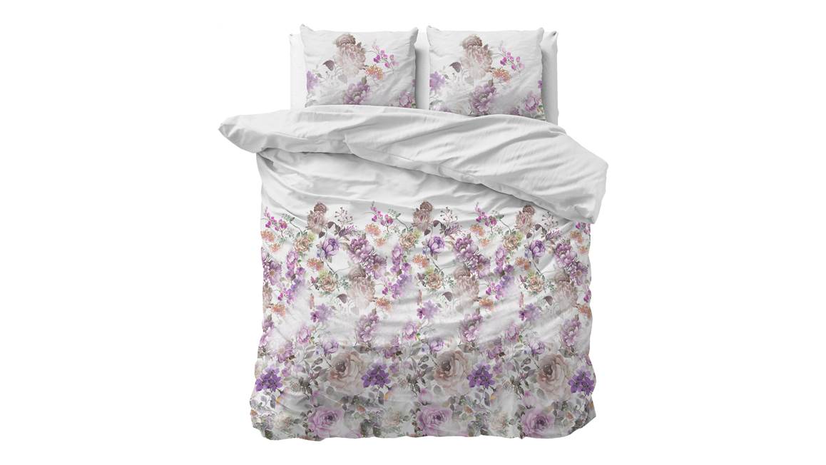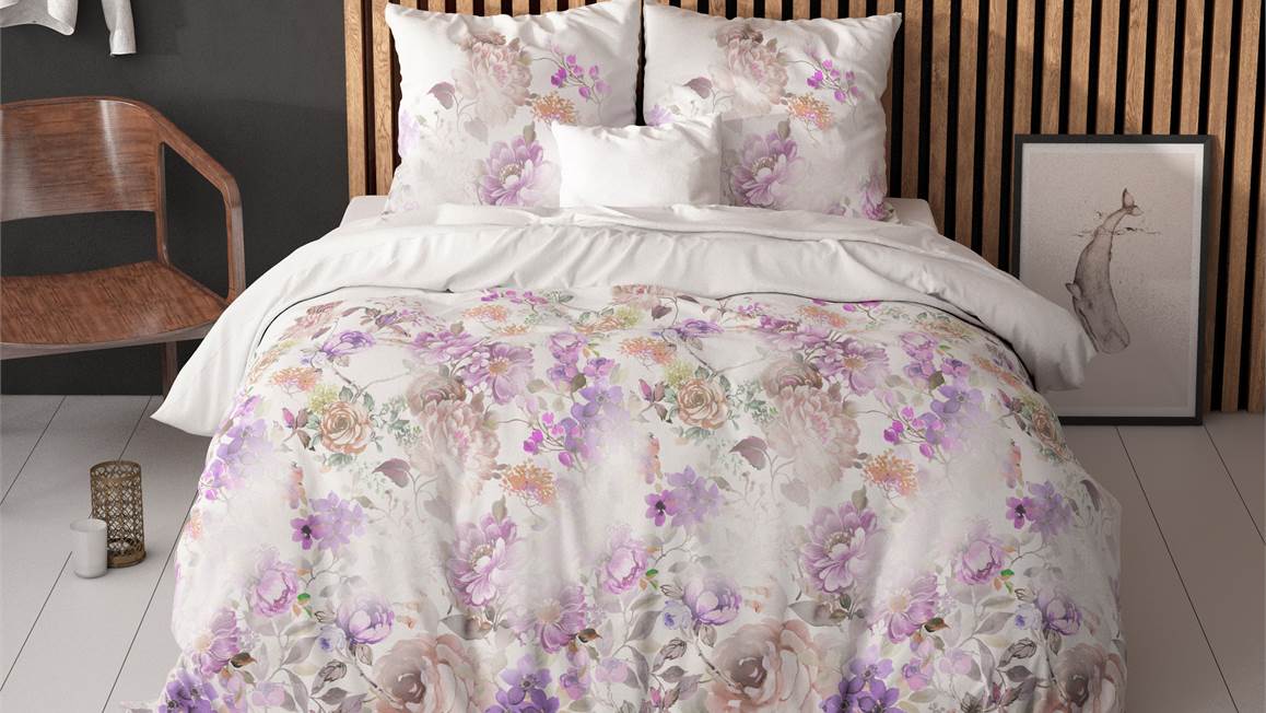 Haal de romantische woonstijl naar de slaapkamer met het Jenice dekbedovertrek. Een overwegend wit dekbedovertrek met prachtige roze en paars gekleurde rozen. Een boeket bloemen op bed, wie wil dat nu niet?
