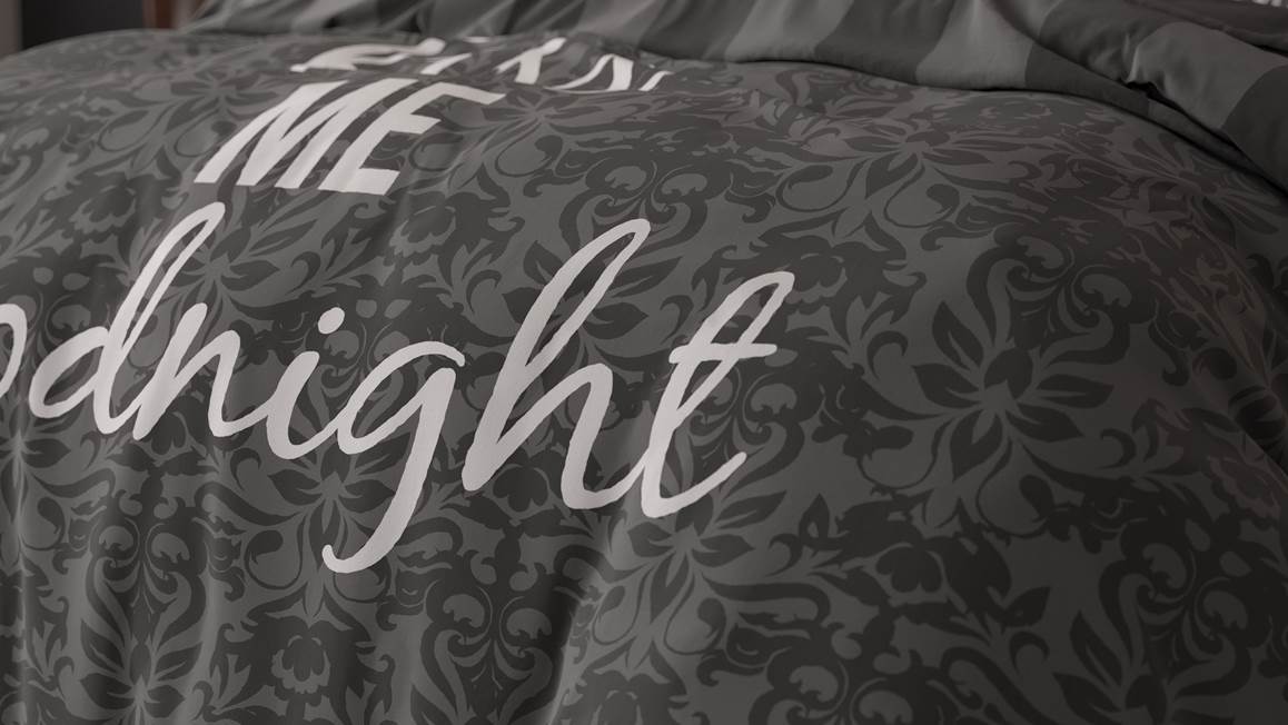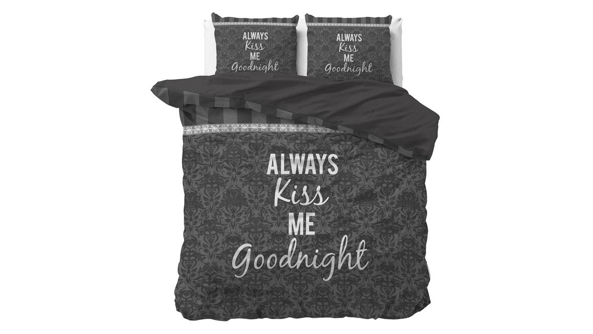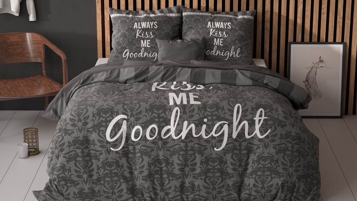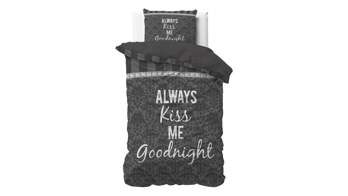 Het Kiss Your Love dekbedovertrek heeft een romantische uitstraling. Op het grijze dessin zie je een leuk patroon van ornamenten. De tekst “Always kiss me goodnight” maakt het plaatje helemaal af!