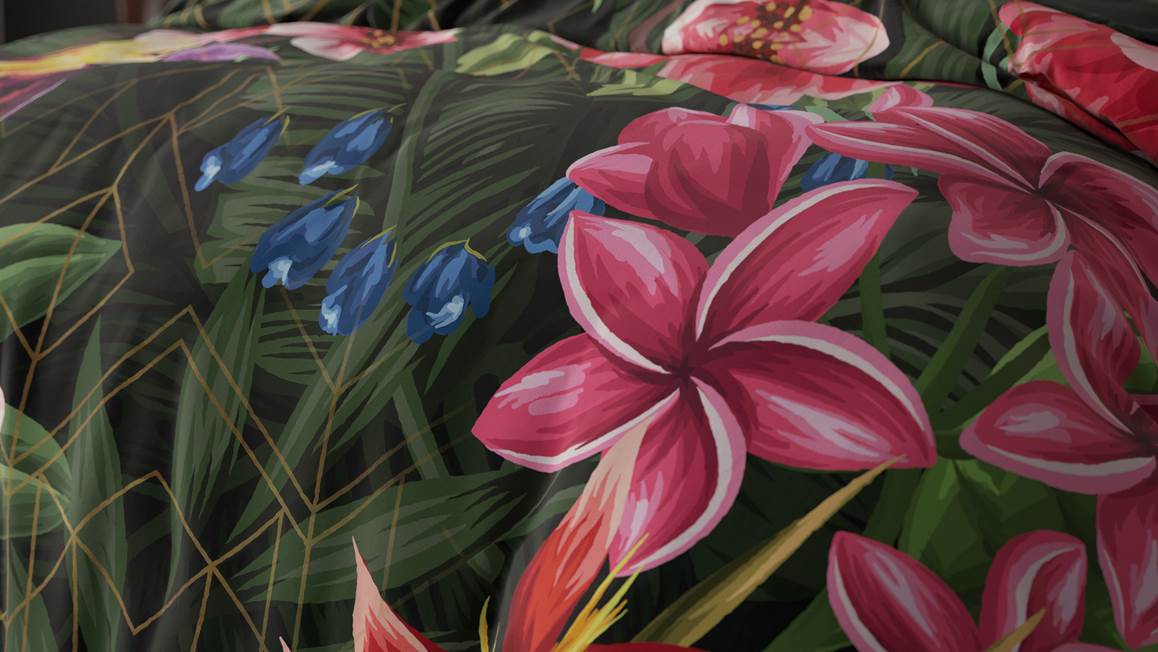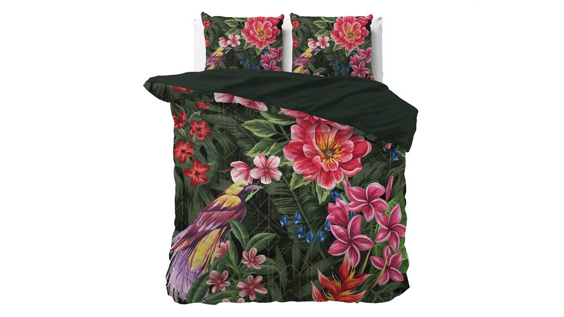 Breng jouw slaapkamer in tropische sferen met het Sleeptime Milou dekbedovertrek. De prachtige grote roze bloemen treken direct jouw aandacht tussen de groene bladeren. De paars met gele vogel maakt het plaatje compleet. De achterzijde is effen, zodat je een luxe omslag kunt maken.