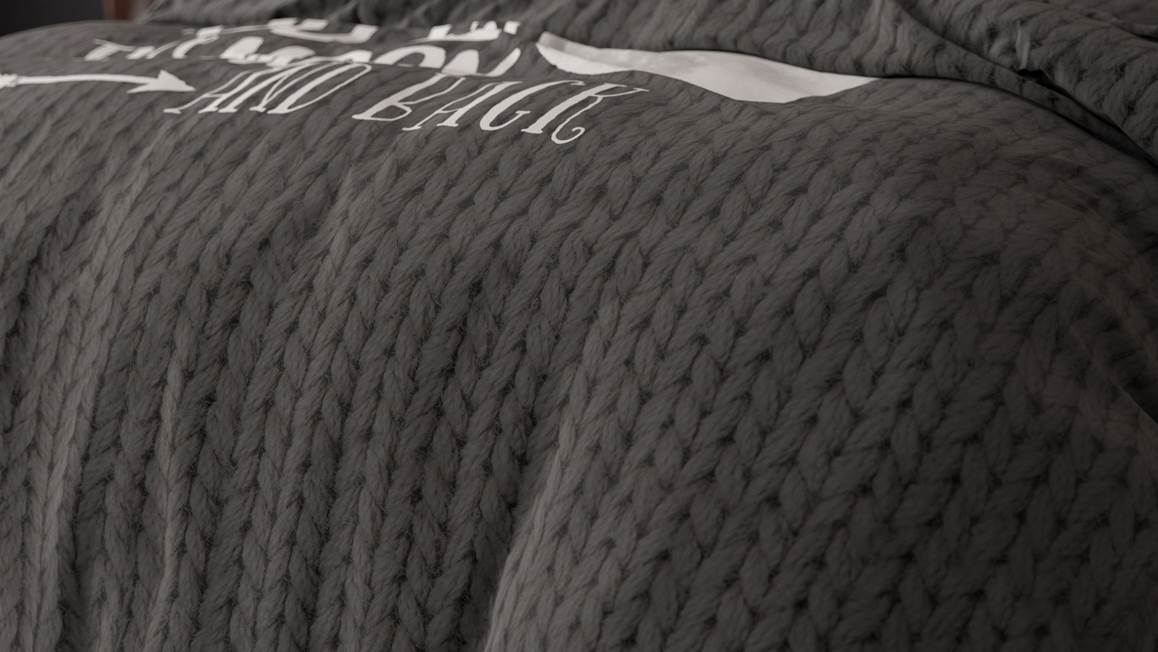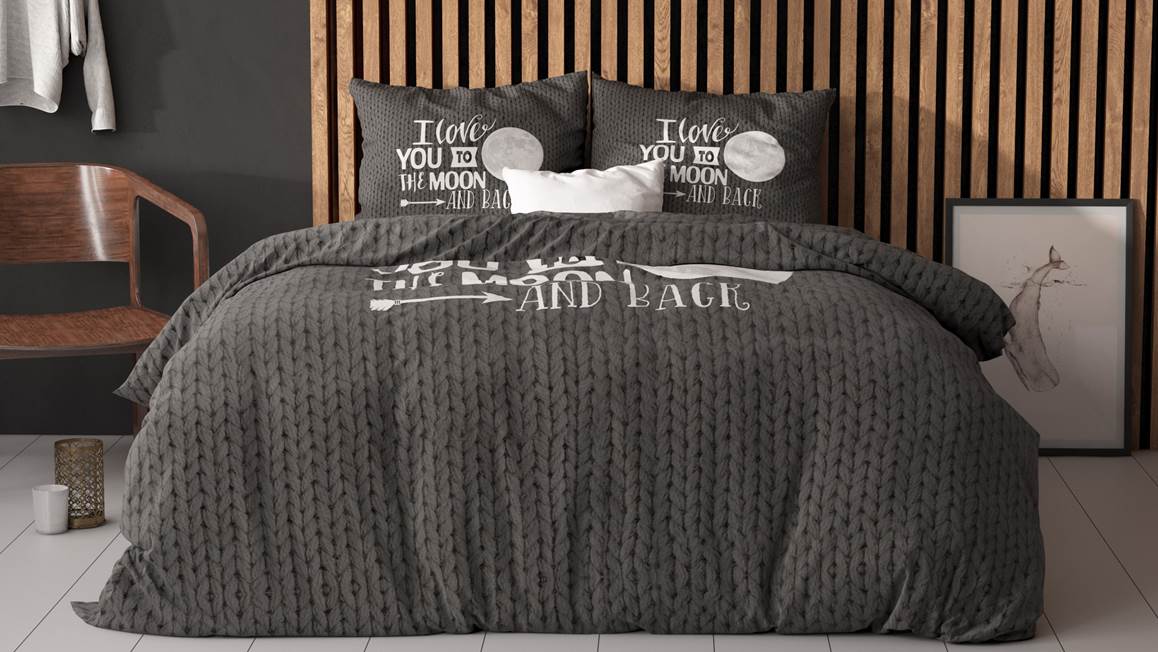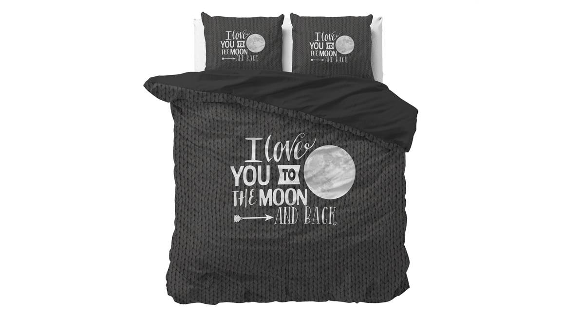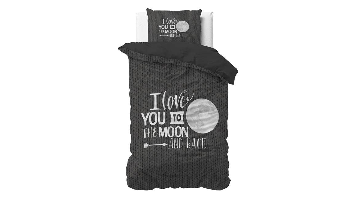 Geniet iedere nacht van een heerlijke nachtrust met het Sleeptime Moon and Back dekbedovertrek. Het antracietkleurige dessin bevat een breipatroon als ondergrond met daarop de liefdevolle tekst “I Love you to the Moon and Back”. De achterzijde is effen zwart.