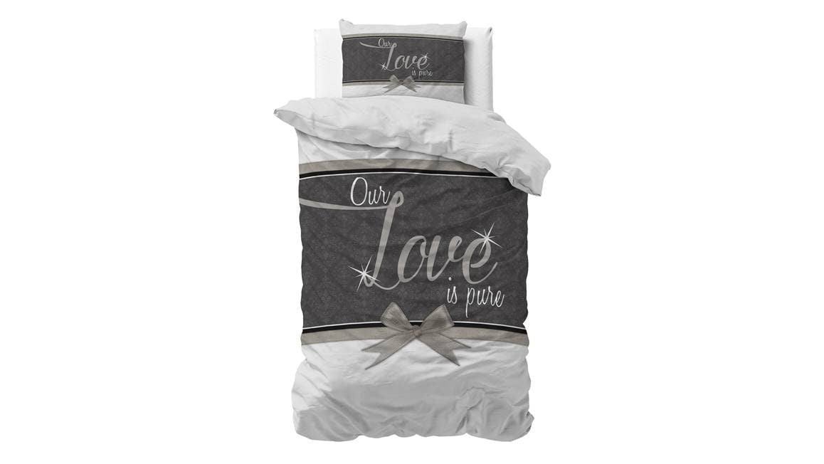 Geef jouw slaapkamer een frisse uitstraling met het Sleeptime Pure Love dekbedovertrek. Het wit met grijze overtrek bevat de tekst “Pure Love” en is afgewerkt met een prachtige strik. Ook komt de print terug op de bijbehorende kussenslopen, zodat er een mooi geheel ontstaat.