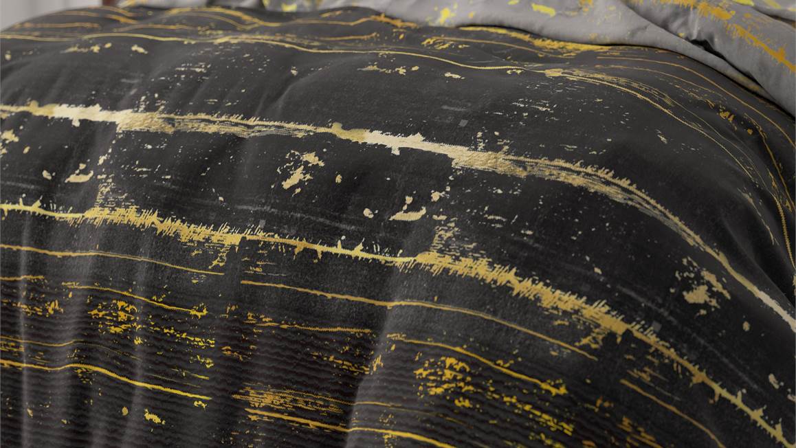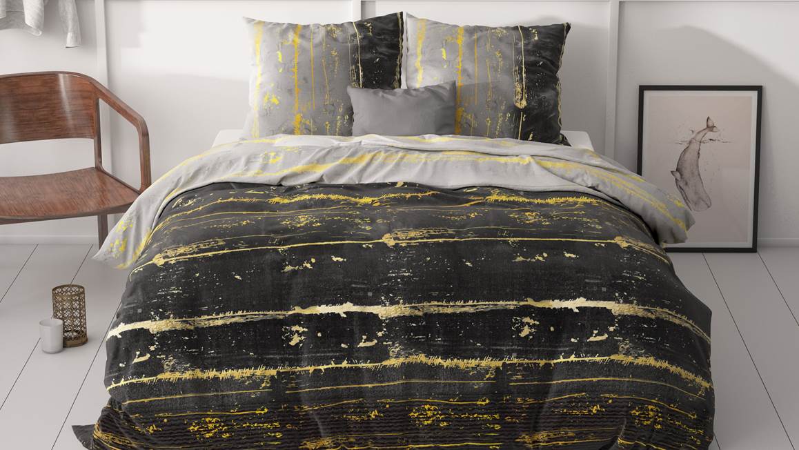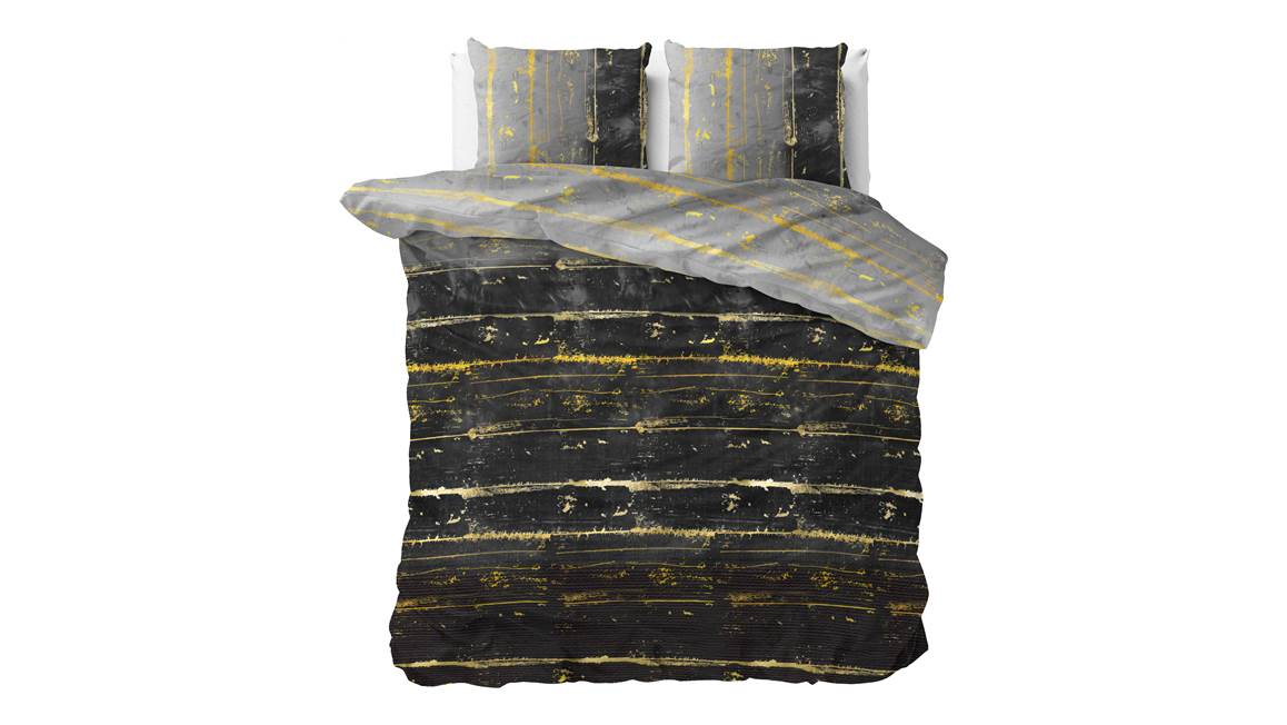Laat je verrassen door de charme van het Sleeptime Scratchy dekbedovertrek. Dit antracieten overtrek verloopt prachtig van licht naar donker, waarop verticale gouden strepen zijn aangebracht. De print is ook op de achterkant aanwezig.