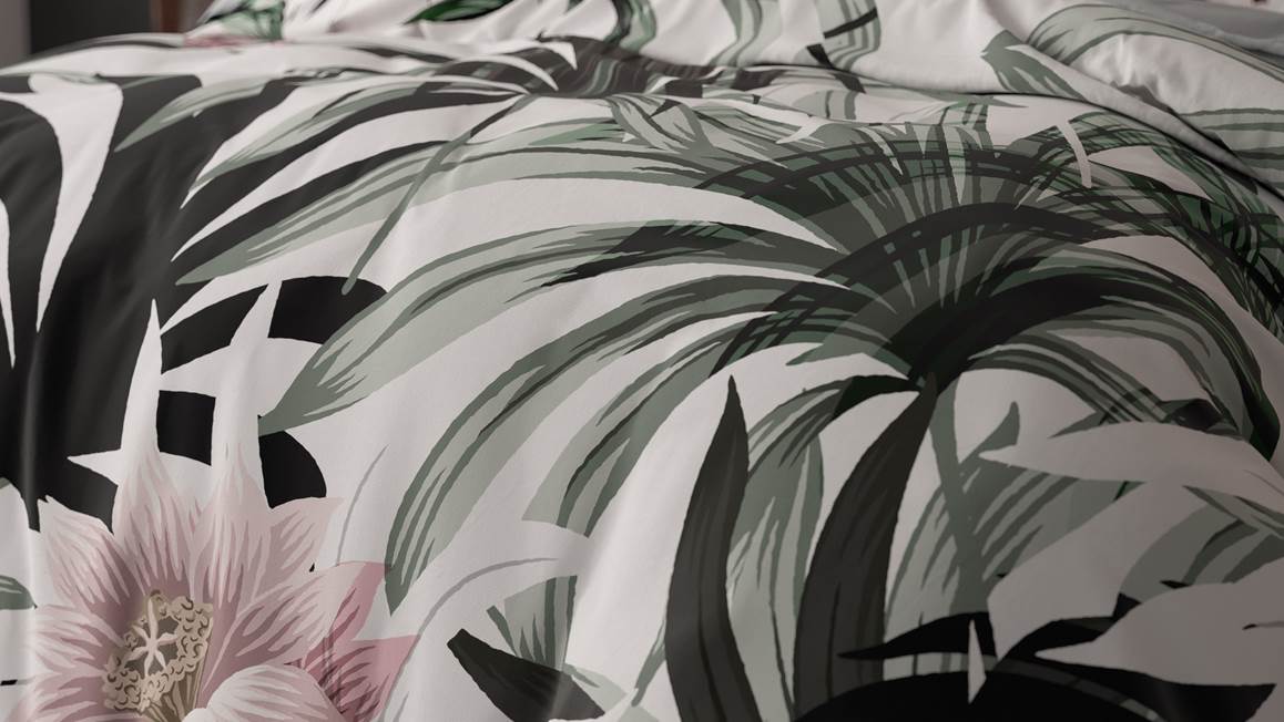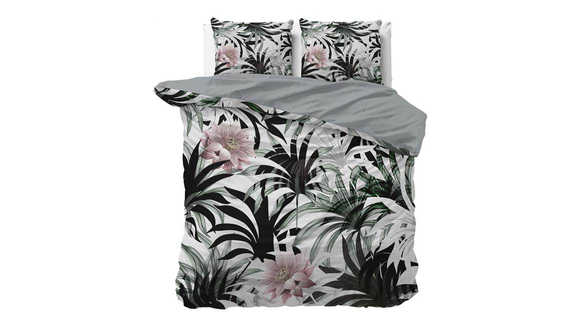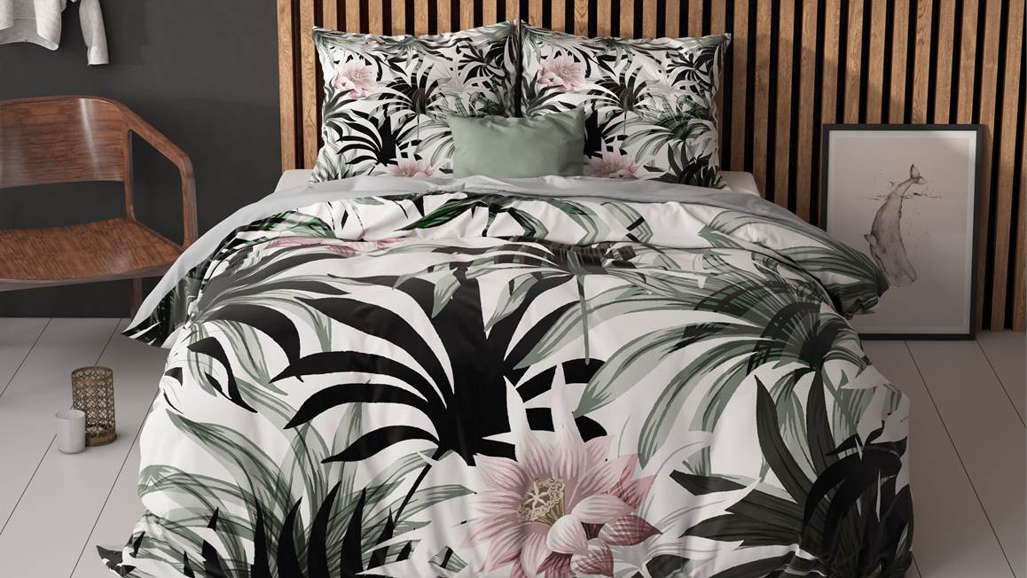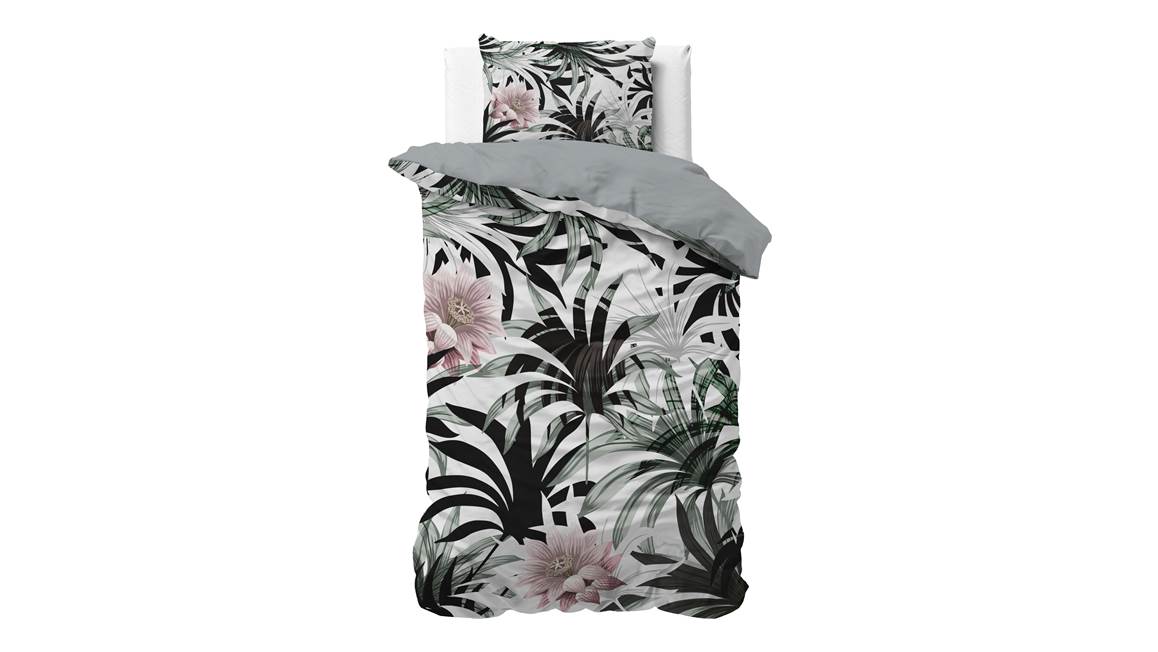 Met het Sleeptime Suzette dekbedovertrek haal je een stukje natuur de slaapkamer binnen. De frisgroene palmen en zachtroze bloemen komen goed tot hun recht op de witte ondergrond. Verder maakt de effen groene achterzijde de look compleet!