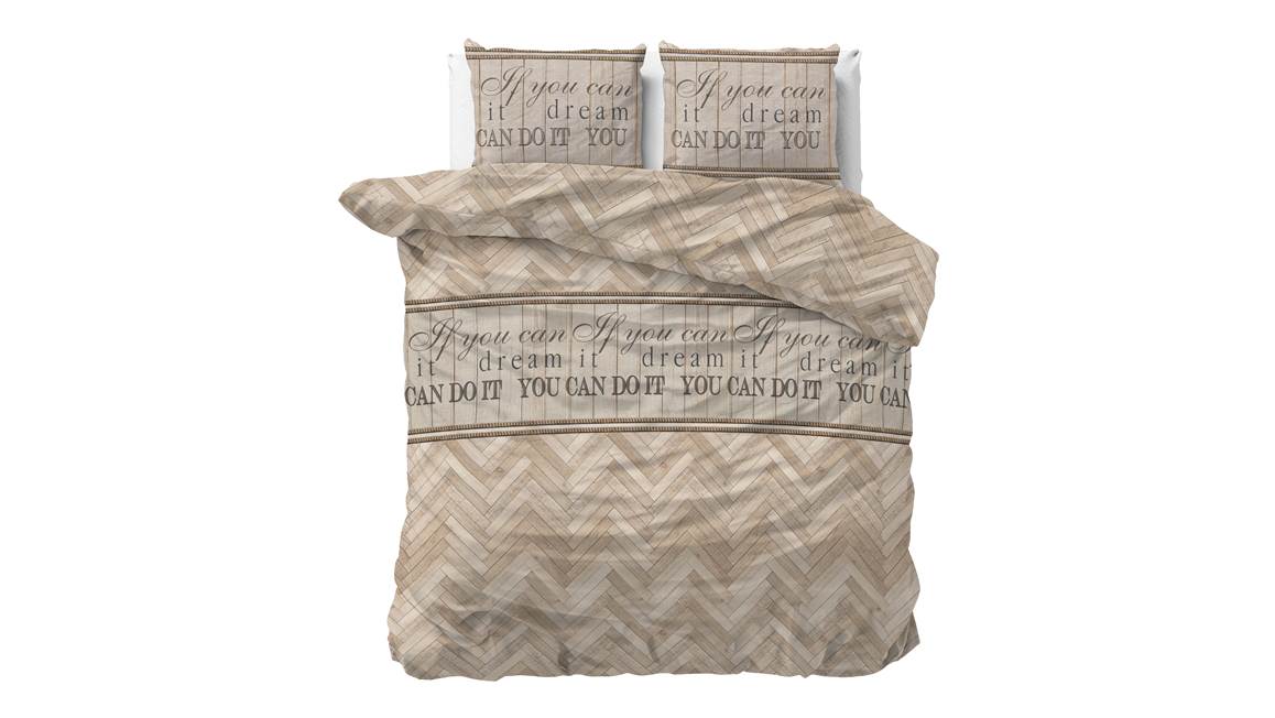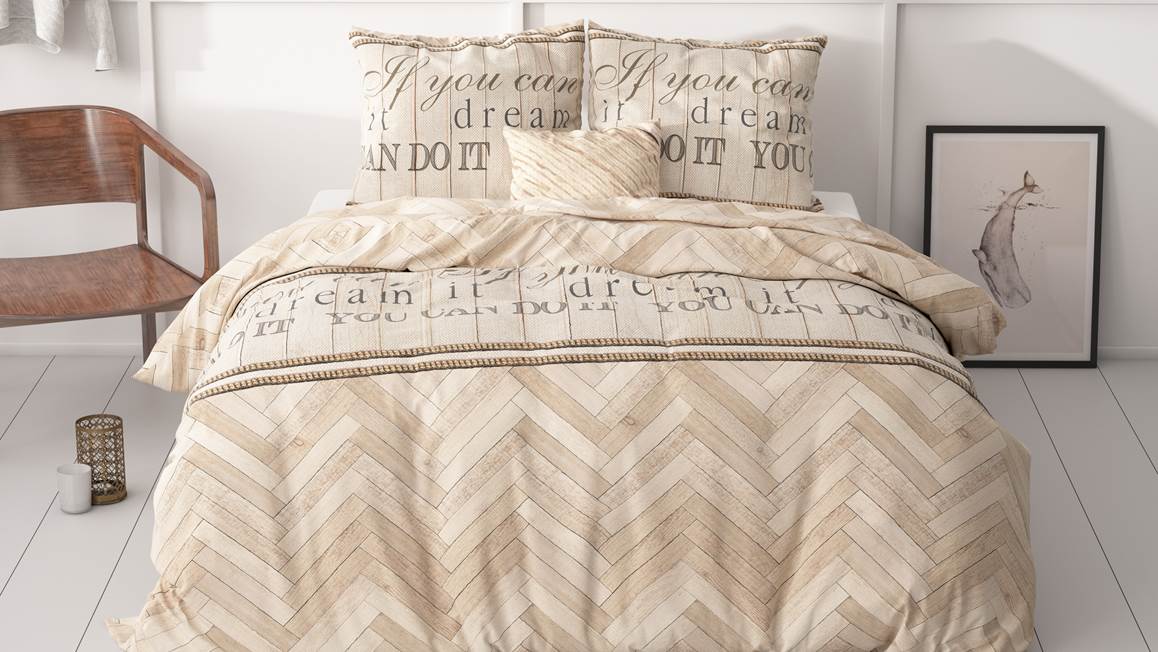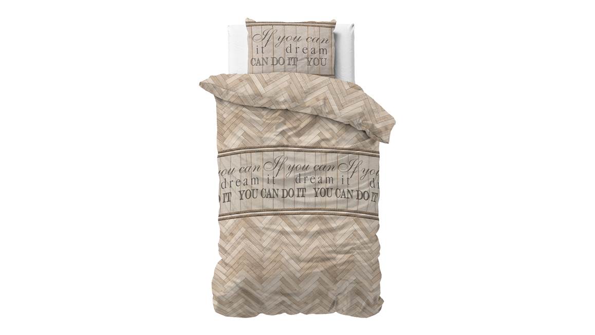 Laat je inspireren en motiveren door het Sleeptime Visgraat dekbedovertrek. Dit zandkleurige overtrek is bedrukt met de krachtige boodschap: “If you can dream it. You can do it.” Deze wijze woorden zijn prachtig verweven in een visgraatpatroon.