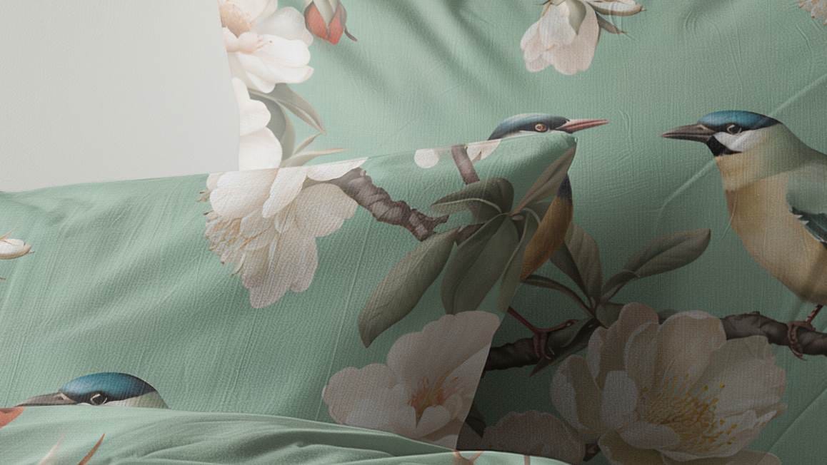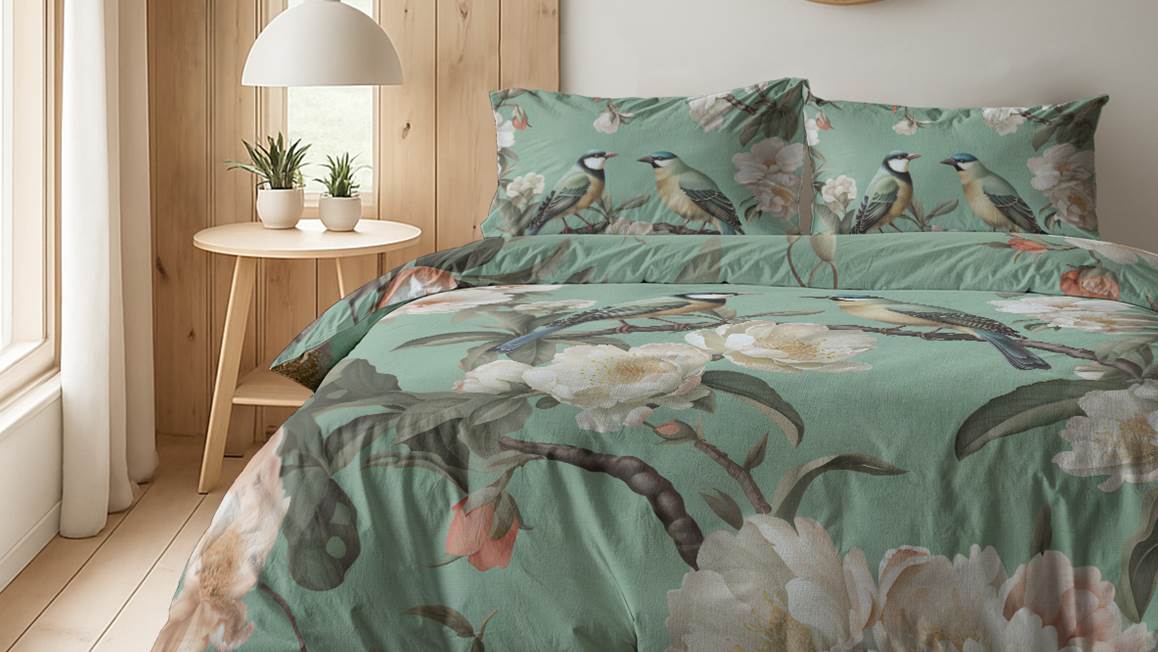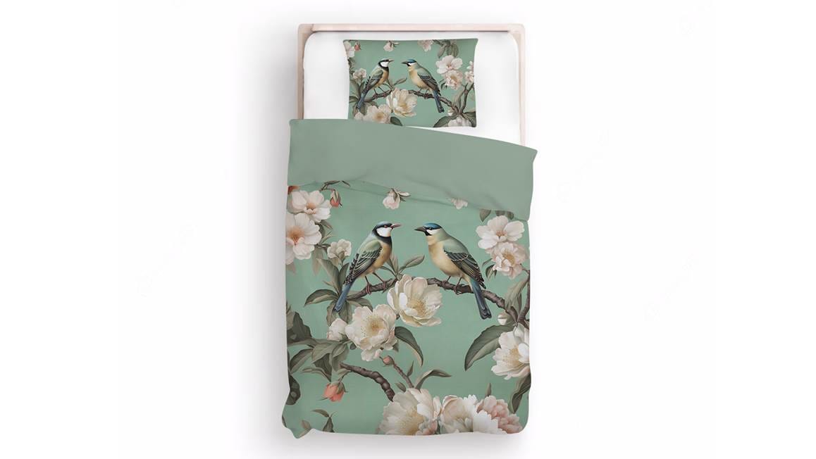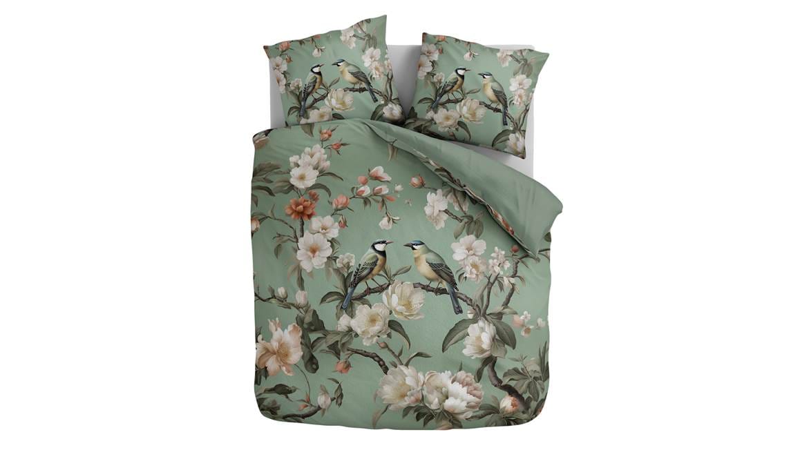 Onder het Serenade Green dekbedovertrek van het merk Zydante kom je iedere avond heerlijk tot rust. Op het zachtgroene dessin staat een print twee vogels rustend op een tak van een boom. Deze boom staat al prachtig in bloei en je kunt de bloesem haast ruiken. Dat is pas echt lekker in slaap vallen!