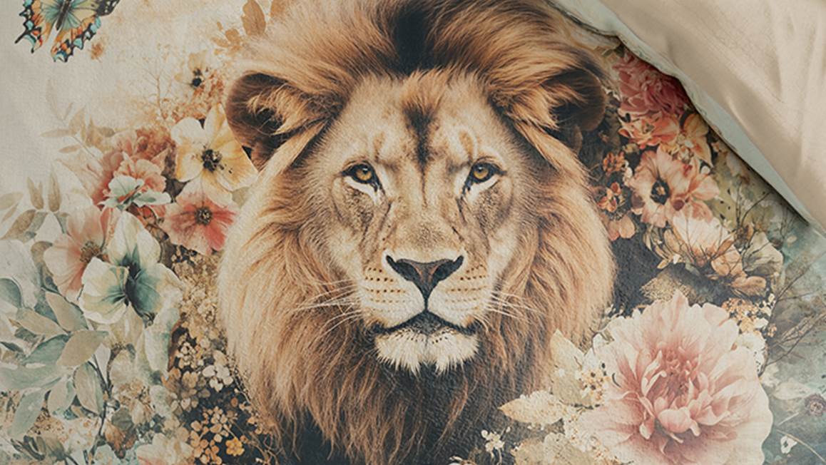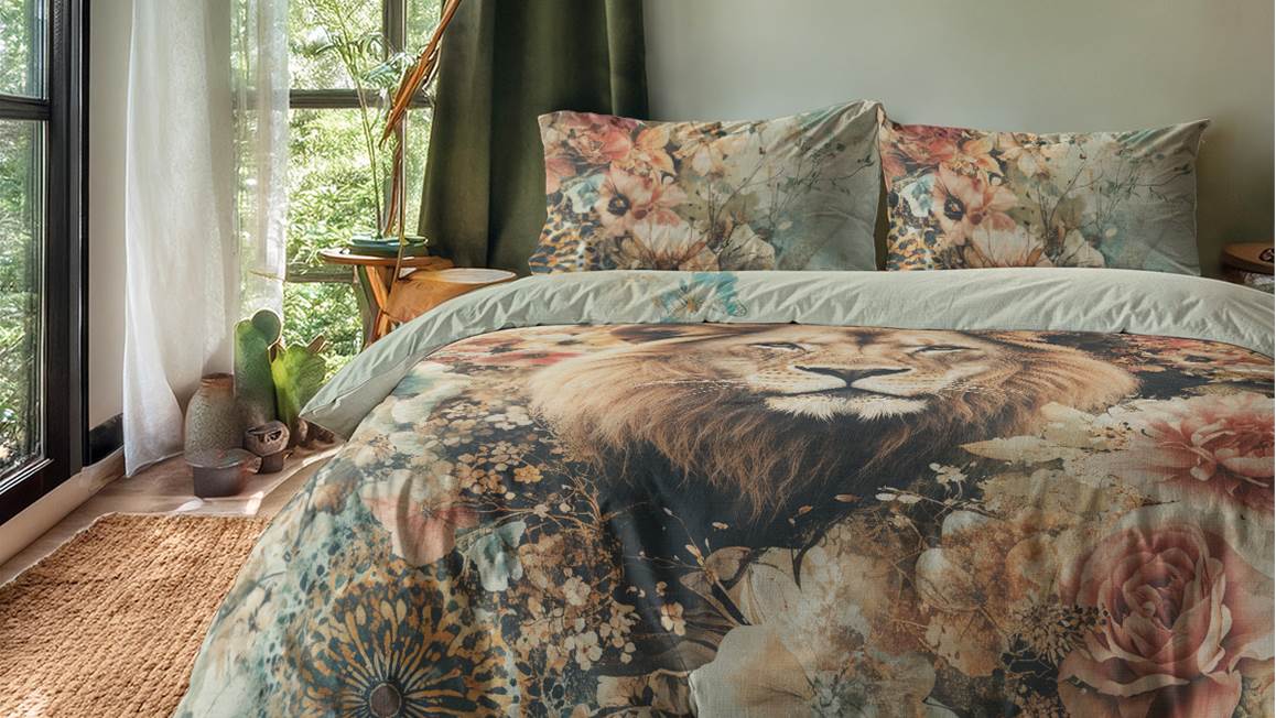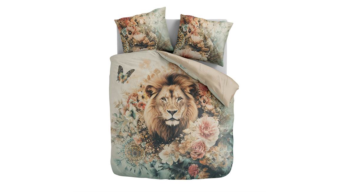 Het Zydante Wildflower King dekbedovertrek is een plaatje om te zien. Een imposante leeuwenkop is natuurlijk stoer, maar krijgt direct een lieflijke uitstraling dankzij de omringende bloemenversiering. Het kleurenpalet is zacht, warm met verschillende beige- en zandtinten en natuurlijk de kleurige bloemen. De achterzijde is effen van kleur. Aan de onderkant zit een handige drukknoopsluiting.